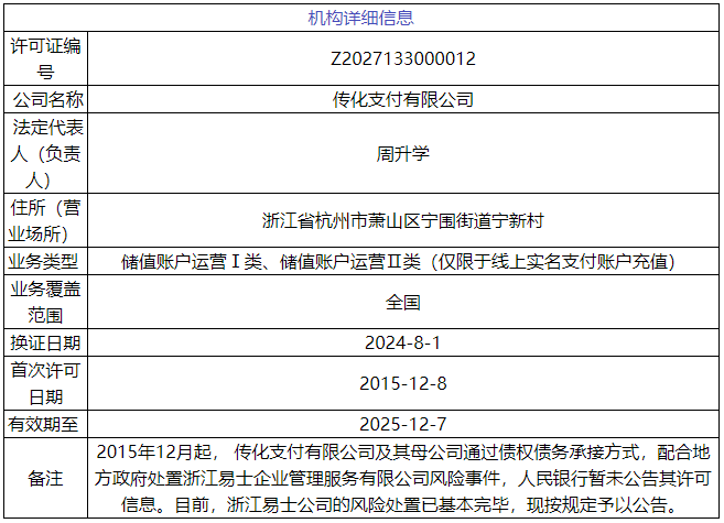 根据央行官网的支付牌照备注信息显示,2015年12月起,传化支付有限公司及其母公司通过债权债务承接方式,配合地方政府处置浙江易士企业管理服务有限公司风险事件。也就是说传化支付是作为承接浙江易士风险处置后“因功获赏”拿到了支付牌照。