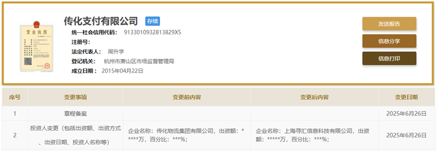 日前,国家企业信用信息显示,支付机构传化支付有限公司(简称“传化支付”)发生了投资人变更,由传化物流集团有限公司变更为上海寻汇信息科技有限公司(简称“上海寻汇”)。